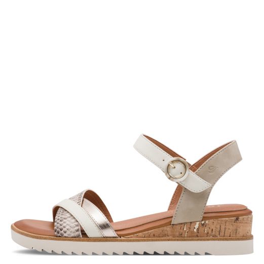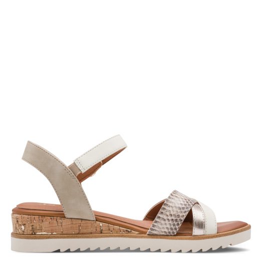 The gold accents and print on the front straps and the gold detailing running through the cork effect wedge are there for added style.