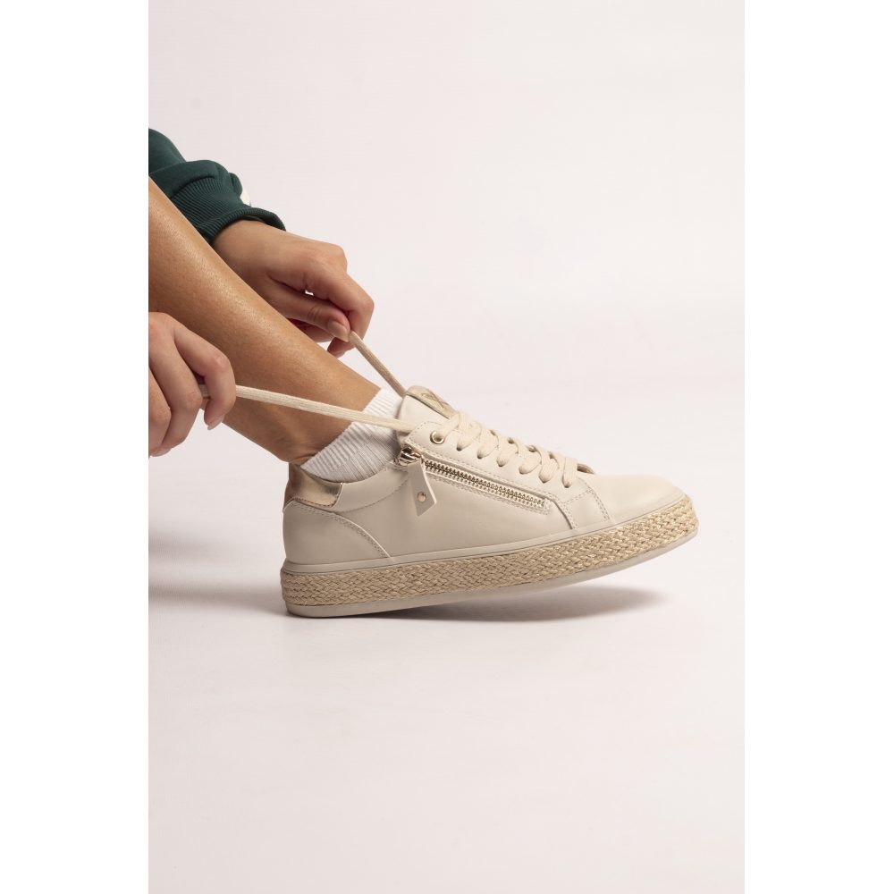 Designed in soft beige with a touch of metallic gold at the heel, it features a woven espadrille-style sole for a chic seasonal update.